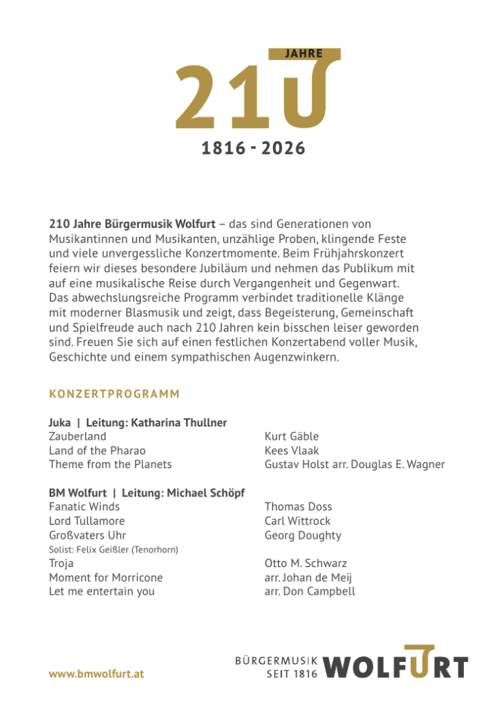 Mit diesem neuen musikalischen Highlight setzt die Bauernkapelle Wolfurt einen besonderen Akzent zum Auftakt der Adventszeit und macht die Vielfalt der Blasmusik in einem stimmungsvollen Rahmen erlebbar…