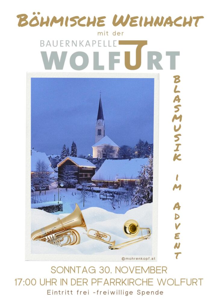 Wolfurt – Am Sonntag, den 30. November 2025, lädt die Bauernkapelle Wolfurt um 17:00 Uhr herzlich zu einem besonderen Konzert in die Pfarrkirche Wolfurt ein. Unter dem Motto „Böhmische Weihnachten“ erwartet die Besucher:innen ein stimmungsvoller musikalischer Einstieg in die besinnliche Zeit des Jahres.